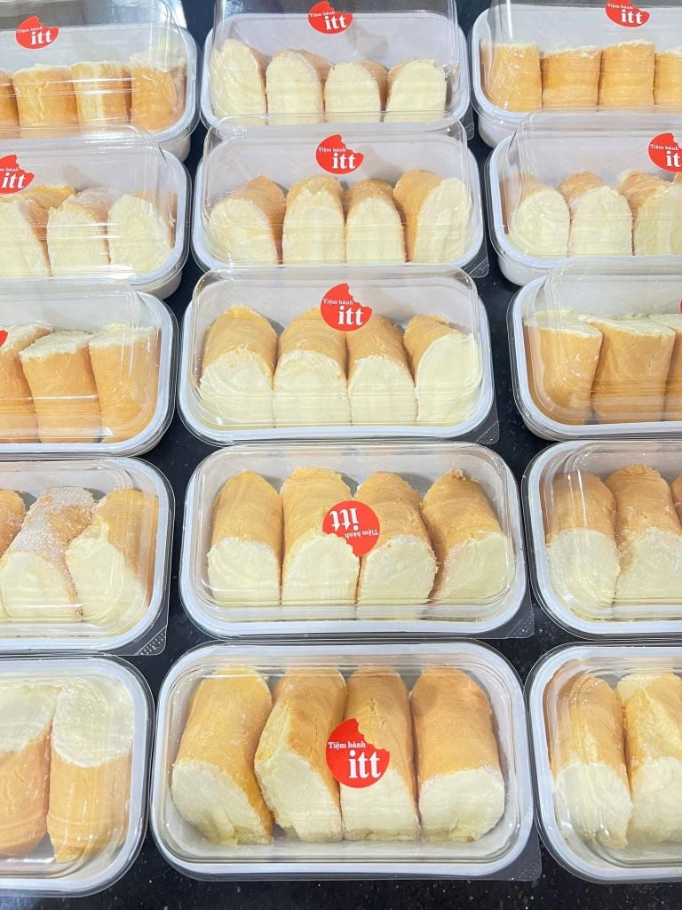 Cốt bánh bông lan tươi mềm, phủ lớp kem sữa mát lạnh, béo nhẹ mà không hề ngấy. Bánh được cắt lát gọn gàng, đóng hộp sạch sẽ – tiện mang đi, tiện ăn vặt cả ngày.